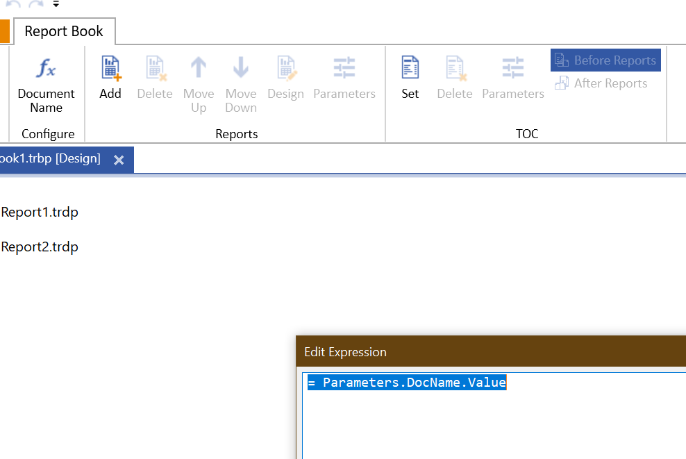 I've added two reports to the book that use a parameter to set the document name. I'm able to set the document name on the individual reports via the html5 viewer, but I can't get it work for the report book. In the Standalone designer it looks you can configure the document name, but none of the parameters are available in the expression editor. I've added them to each individual report and they both use the same parameter name.