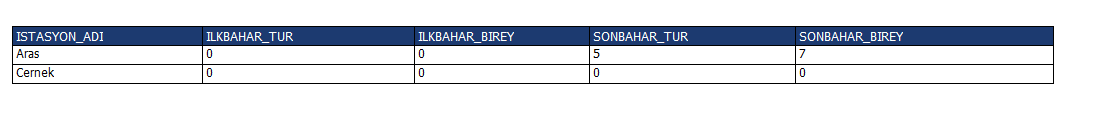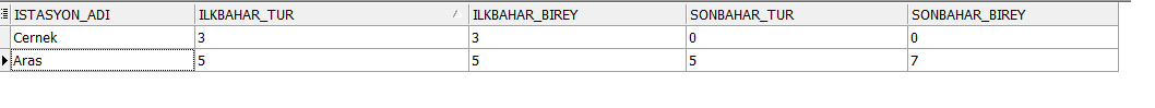 WITH T AS (SELECT P.PARAMETRE_ADI AS ID,HI.ISTASYON_ADI,HTS.TUR_ID AS TID FROM HALKALAMA_CALISMALARI t JOIN HALKALAMA_TUR_SAYILARI HTS ON HTS.HALKALAMA_CALISMA_ID = T.ID JOIN HALKALAMA_ISTASYONLARI HI ON HI.ID = T.HALKALAMA_ISTASYON_ID JOIN PARAMETRELER P ON P.ID = T.PARAM_HALKALAMA_DONEMI_ID) SELECT ISTASYON_ADI,ILKBAHAR_TUR, ILKBAHAR_BIREY,SONBAHAR_TUR,SONBAHAR_BIREY FROM T PIVOT(COUNT(DISTINCT TID) AS TUR,COUNT(*) AS BIREY FOR ID IN ('İlkbahar' AS ILKBAHAR,'Sonbahar' AS SONBAHAR))