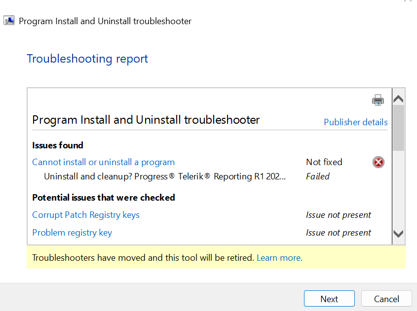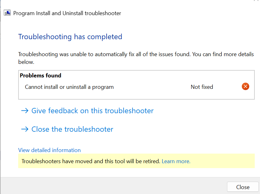 I tried that "troubleshooter" tool from Microsoft, but it failed. that "learn more" link is nothing more than a dead end. Any other solution?