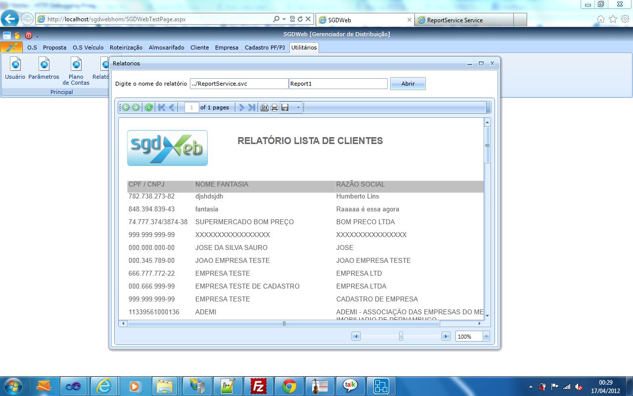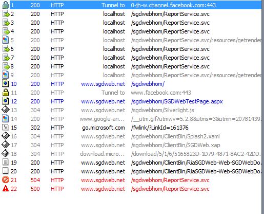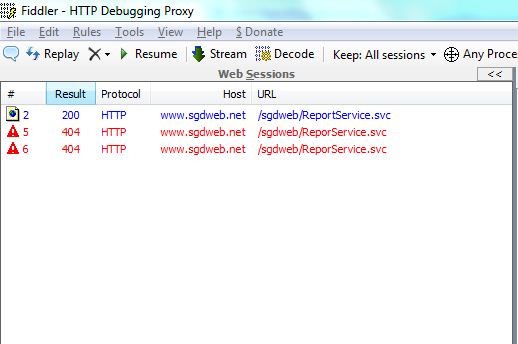 - access the .svc file directly in your browser to see if it reports any problems. OK NO ERROR http://www.sgdweb.net/sgdweb/ReportService.svc or http://www.sgdweb.net/sgdwebhom/ReportService.svc