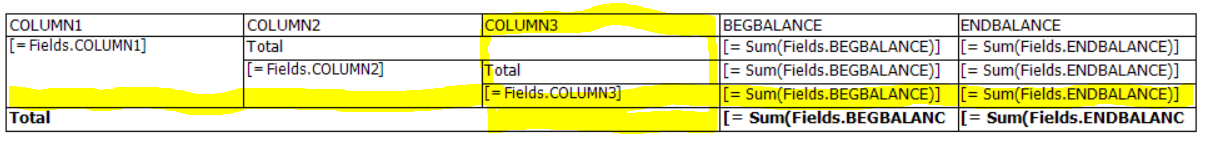 I would like to hide the "Column3" column and the "Column3" row based on the value of a report parameter. I can't seem to figure out how to do this with conditional formatting as you can't apply that to a whole column or row in a crosstab. Can this be done?