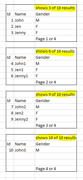 in each page, let say i have 10 rows and i set 3 data per page. The report will show the max row number ("show 3 of 10 result." in the 1st page and for next page will show "show 6 of 10" )