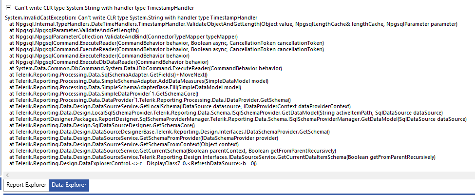 When I click "Execute Query" on the preview data source results screen in the configure SQL Data Source wizard am presented with an error such as: Can't write CLR type System.String with handler type TimestampTzHandler or Can't write CLR type System.String with handler type TimestampHandler.