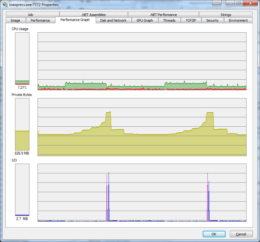 See in attachment, a graph of CPU, memory and IO. large IO spikes is basically when the app is writing a report to the disk.