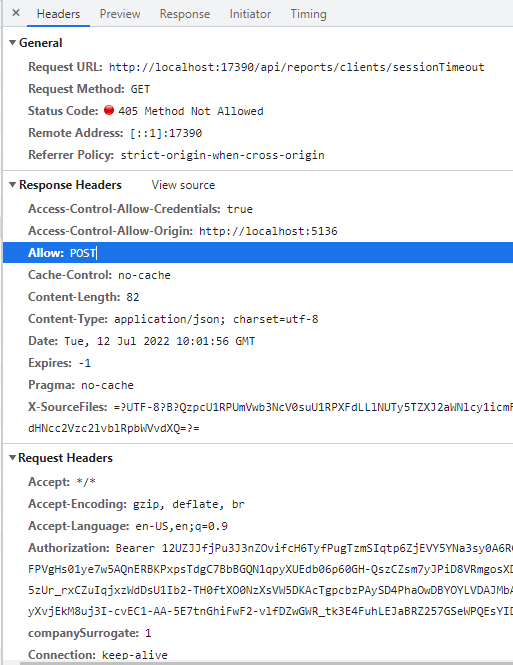 405 Method Not Allowed to http://localhost:17390/api/reports/clients/sessionTimeout request.