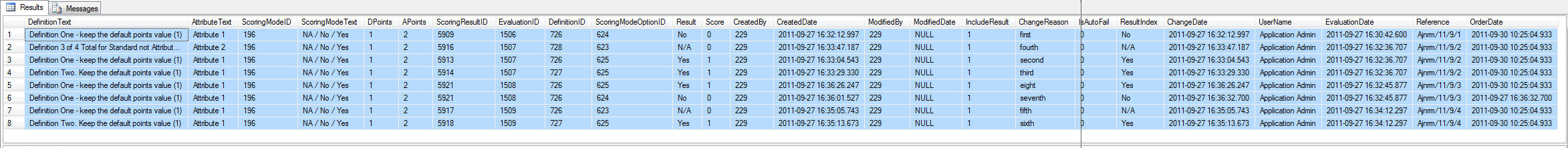 Definition One - keep the default points value (1);Attribute 1;196;NA / No / Yes;1;2;5917;1509;726;623;N/A;0;229;2011-09-27 16:35:05.743;229;NULL;1;fifth;0;N/A;2011-09-27 16:35:05.743;Application Admin;2011-09-27 16:34:12.297;Ajnrm/11/9/4;2011-09-30 10:25:04.933