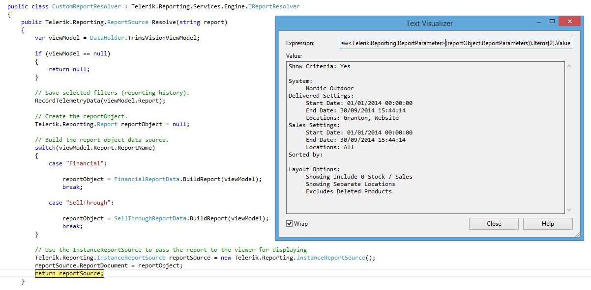 Couple of screenshots - 1 is a watch on ReportObject.ReportParameters.Item[2] - showing the correct text that I'm expecting to see in the report.