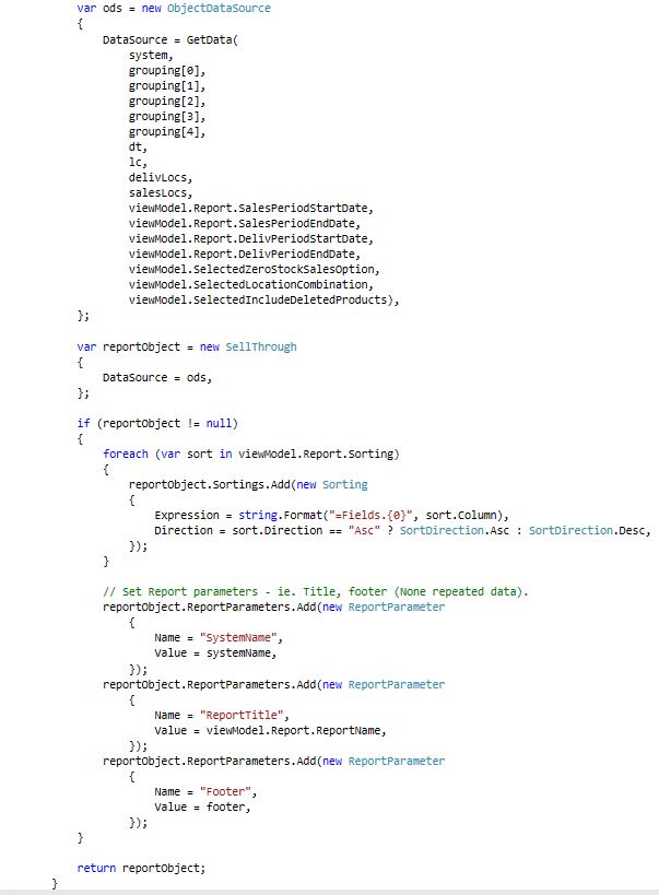 The following screenshot taken from the BuildReport routine, above this code I place values from the viewModel that is passed into formatted strings, ie, system, footer, reportName. The screenshot then shows how I am adding these parameters to the report. Note that the report (in designer) does not have any parameters defined.