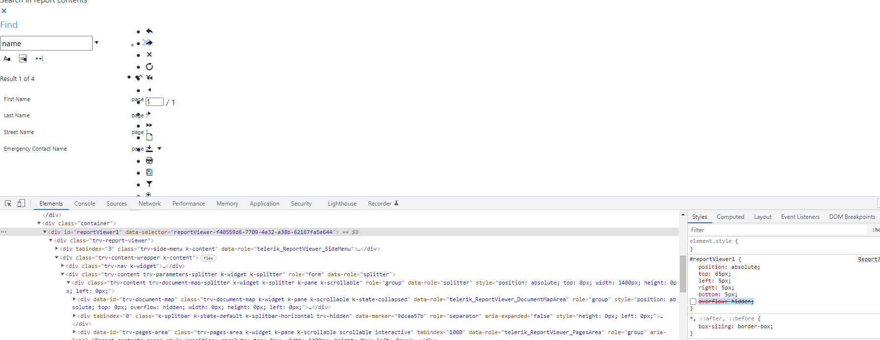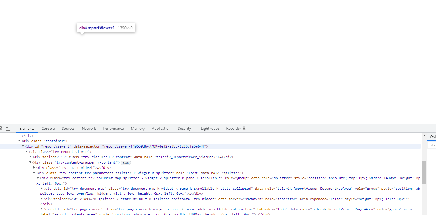 Based on the screenshots, I suspect that this is a styling issue. As you can see in the div screenshot, the viewer is rendered with 0 height. You may test to compare your page of the viewer with some of our demos with the Html5 Report Viewer which can be found in the installation folder of Telerik Reporting: