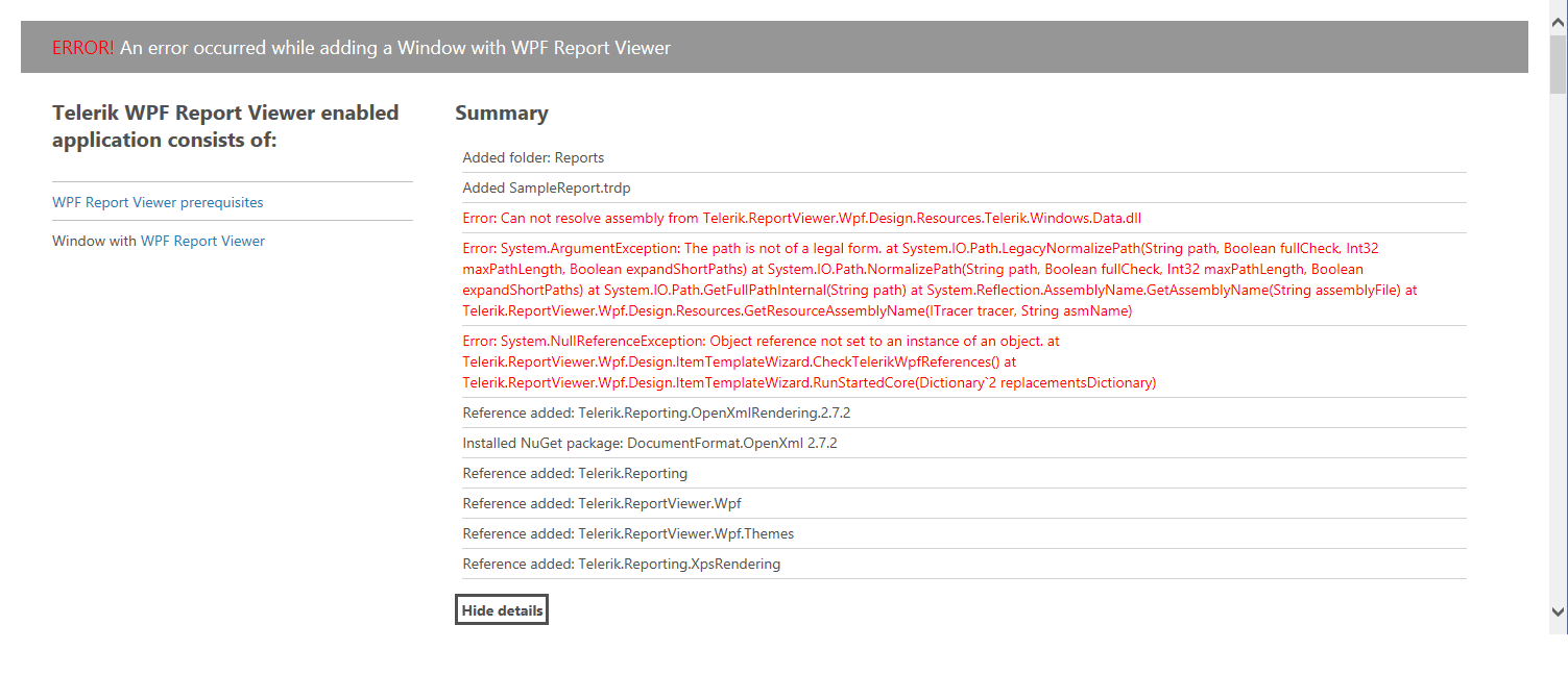 I also tried removing and adding the ReportViewer via the Wizard to let the Telerik Extension for Visual Studio automatically configure the project, but I get the error in the picture attached: apparently, it manages to add the dependencies required in documentation, but it fails to add Telerik.ReportViewer.Wpf.Design.Resources.Telerik.Windows.Data, probably because of path problems.