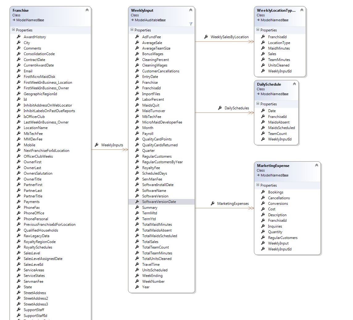 var data = from week in base.Db.WeeklyInputs where week.FranchiseId == franchiseId && week.Year == year select new { week.FranchiseId, week.WeekEnding, week.CleaningWages, week.BonusWages, week.TotalMaidsAbsent, week.TotalMaidsScheduled, week.MaidTurnover, week.TotalMaidMinutes, week.AverageTeamSize, week.TravelTime, week.QualityCardsReturned, week.QualityCardPoints, Cancels = week.CustomerCancellations, Name = week.Franchise.Title, TotalRev = week.WeeklySalesByLocation.Sum(sales => sales.Sales), TotalUnitsCleaned = week.WeeklySalesByLocation.Sum(s => s.UnitsCleaned), AverageQualityPoints = week.QualityCardsReturned == 0 ? 0 : week.QualityCardPoints/week.QualityCardsReturned, AverageHourlyWage = week.TotalMaidMinutes == 0 ? 0 : (week.CleaningWages)*60/(week.TotalMaidMinutes), RegularRev = week.WeeklySalesByLocation .Where(s => s.LocationType == "Regular").Sum(sales => sales.Sales), FirstRev = week.WeeklySalesByLocation .Where(s => s.LocationType == "FirstEntry").Sum(sales => sales.Sales), OnCallRev = week.WeeklySalesByLocation .Where(s => s.LocationType == "OnCall").Sum(sales => sales.Sales), CommercialRev = week.WeeklySalesByLocation .Where(s => s.LocationType == "Commercial").Sum(sales => sales.Sales), Conversions = week.MarketingExpenses .Sum(marketing => marketing.Conversions), Locations = week.WeeklySalesByLocation .Select(l => new { l.Sales, l.LocationType, l.UnitsCleaned, l.TeamMinutes, l.MaidMinutes, AverageSale = l.UnitsCleaned == 0 ? 0 : l.Sales/l.UnitsCleaned, AverageTime = l.UnitsCleaned == 0 ? 0 : l.MaidMinutes/l.UnitsCleaned, AverageRevPerMaidHour = l.MaidMinutes == 0 ? 0 : (l.Sales/l.MaidMinutes)*60 }), AverageRevenuePerInHomeMaidHour = (week.TotalMaidMinutes + (week.TravelTime*week.AverageTeamSize)) == 0 ? 0 : week.WeeklySalesByLocation.Sum(sales => sales.Sales)/ (week.TotalMaidMinutes + (week.TravelTime*week.AverageTeamSize))*60 };hmmm... I didn't think so....