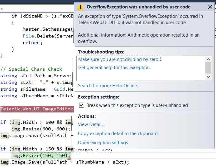 I agree obviously there is something in the full project that is in conflict, my hope was you could point me into what would cause the Resize function on the ImageEditor to throw the 'Overflow' error since the error is coming directly from the Telerik control, it is hard for me to figure out beyond this. The isolated project had the same web.config file and the save code is exactly the same as well. I will keep looking but if you have any ideas on where would be the most productive that would be great since I don't really have days to spend on this.....Thanks!