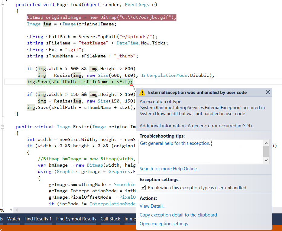- Open GDIResize.aspx.cs file and change the path passed to the original image object in order to point one of the problematic images