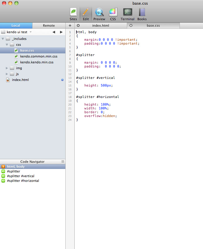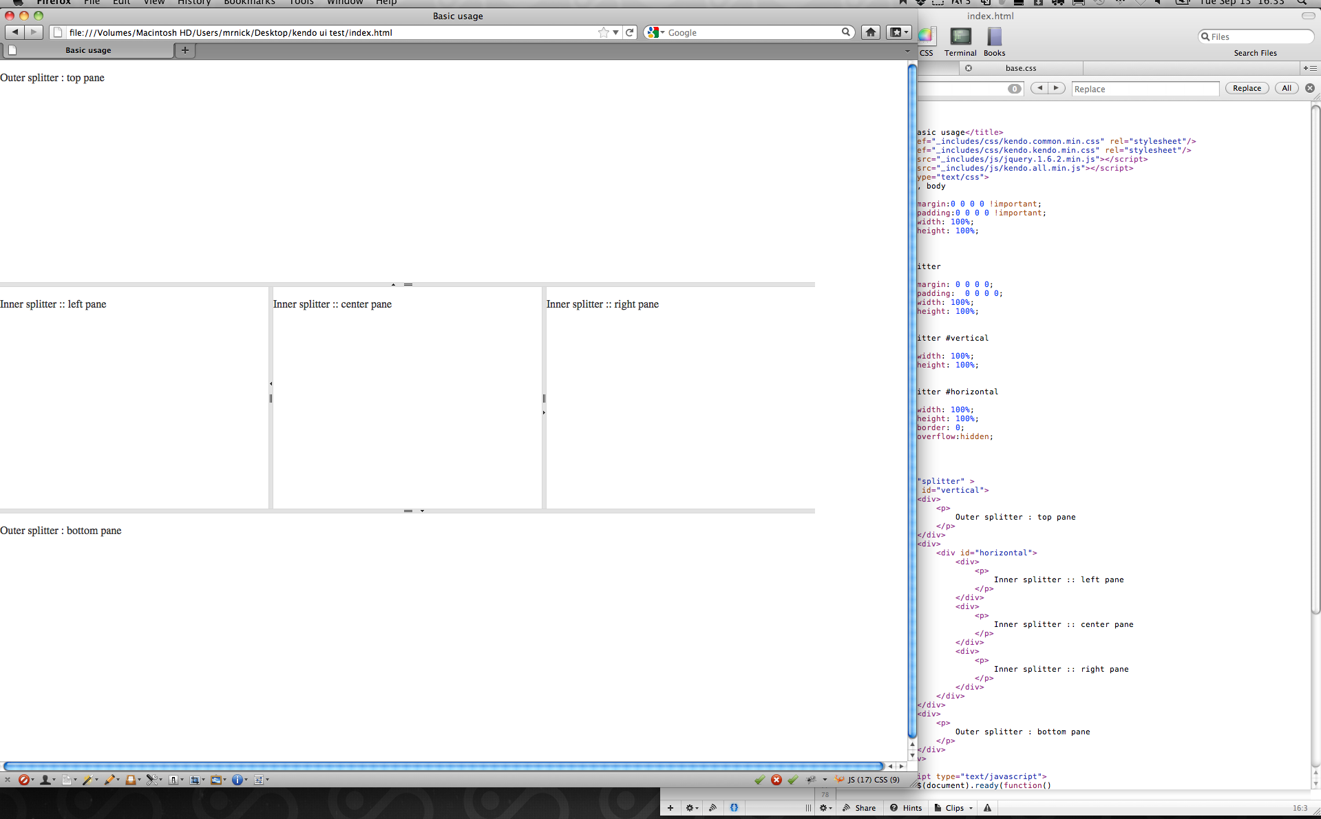 01.<!doctype html>02.<html>03. <head>04. <title>Basic usage</title>05. <link href="_includes/css/base.css" rel="stylesheet"/>06. <link href="_includes/css/kendo.common.min.css" rel="stylesheet"/>07. <link href="_includes/css/kendo.kendo.min.css" rel="stylesheet"/>08. <script src="_includes/js/jquery.1.6.2.min.js"></script>09. <script src="_includes/js/kendo.all.min.js"></script>10. </head>11. <body>12. <div id="splitter" >13. <div id="vertical">14. <div id="top">15. <p>16. Outer splitter : top pane17. </p>18. </div>19. <div>20. <div id="horizontal">21. <div id="left">22. <p>23. Inner splitter :: left pane24. </p>25. </div>26. <div id="center">27. <p>28. Inner splitter :: center pane29. </p>30. </div>31. <div id="right">32. <p>33. Inner splitter :: right pane34. </p>35. </div>36. </div>37. </div>38. <div id="bottom">39. <p>40. Outer splitter : bottom pane41. </p>42. </div>43. </div>44. 45. <script type="text/javascript">46. $(document).ready(function() 47. {48. $("#splitter #vertical").height($(window).height() - 2)49. 50. function onResize(e) 51. {52. console.log("Resized :: Splitter #" + this.element[0].id);53. console.log(this.element[0]);54. };55. 56. $("#vertical").kendoSplitter({57. orientation: "vertical",58. panes: [59. { collapsible: true, size: "30%" }, // top height60. { collapsible: false, size: "40%" },61. { collapsible: true, size: "30%" } // bottom height62. ],63. resize: onResize64. });65. 66. $("#horizontal").kendoSplitter({67. panes: [68. { collapsible: true, size: "20%" }, // left height69. { collapsible: false, size: "60%" }, // center70. { collapsible: true, size: "20%" } // right height71. ],72. resize: onResize73. });74. 75. $(window).resize(function() 76. {77. // what do i put here to force resize refresh of all splitters ???78. });79. });80. </script>81. </div>82. </body>83.</html>