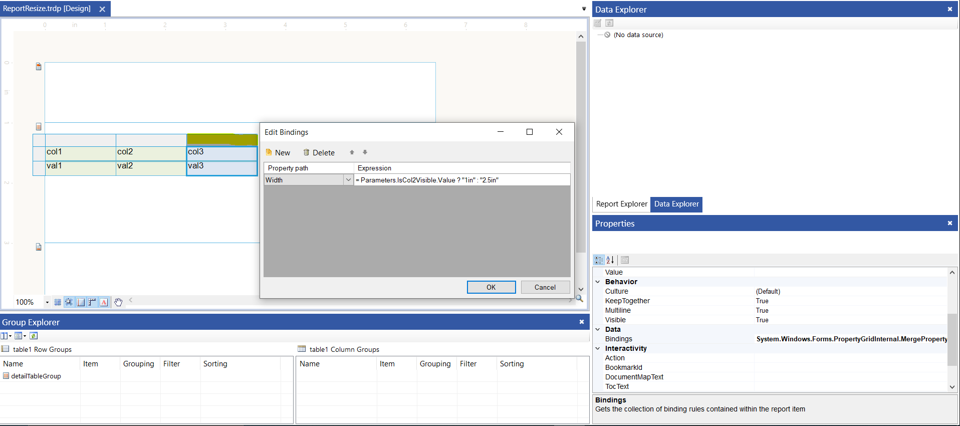 I have attached a sample report and a short video of me creating the bindings to the columns and displaying the effects of those bindings at runtime.