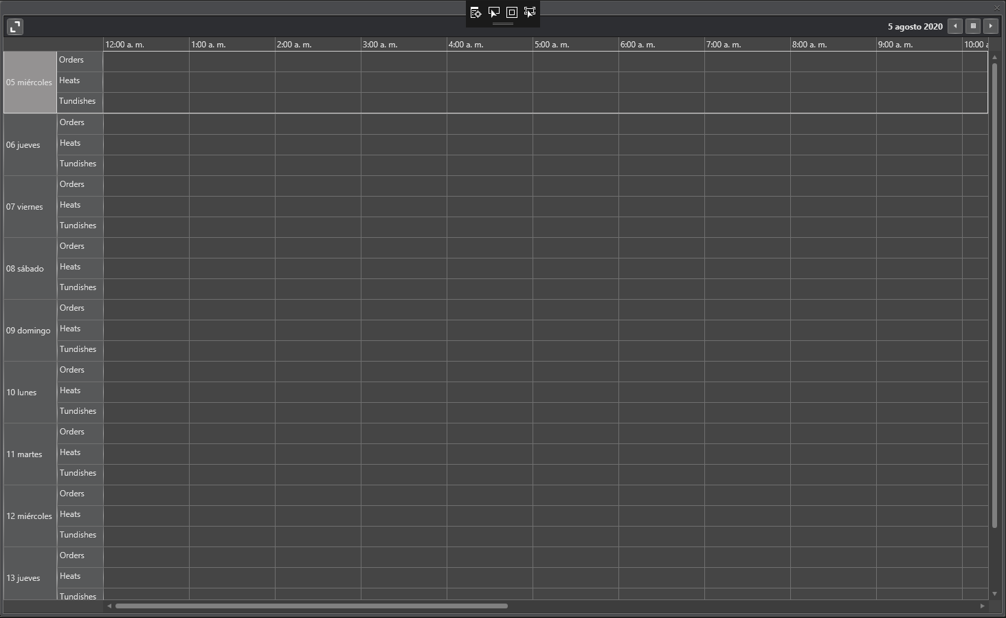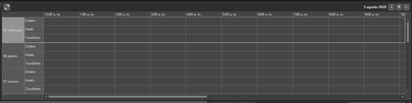 <scheduleView:RadScheduleView x:Name="scheduleViewOrders" Grid.RowSpan="2" BorderThickness="0 1 1 1" MinAppointmentHeight="20" FirstVisibleTime="00:00" GroupHeaderContentTemplateSelector="{StaticResource CustomGroupHeaderContentTemplateSelector}" AppointmentItemContentTemplate="{ StaticResource AppointmentTemplate}" ResourceTypesSource="{StaticResource ResourcesTypes}" PreviewMouseWheel="ScheduleViewOrders_PreviewMouseWheel" xmlns:local="clr-namespace:ProductionScheduler.ViewModel.Production" HorizontalScrollBarVisibility="Visible" > <scheduleView:RadScheduleView.ActiveViewDefinition> <scheduleView:DayViewDefinition GroupFilter="{Binding GroupFilter}" Orientation="Horizontal" VisibleDays="10" MinorTickLength="1h" MajorTickLength="1h" MinTimeRulerExtent="3000"/> </scheduleView:RadScheduleView.ActiveViewDefinition> <scheduleView:RadScheduleView.GroupDescriptionsSource> <scheduleView:GroupDescriptionCollection> <scheduleView:DateGroupDescription></scheduleView:DateGroupDescription> <scheduleView:ResourceGroupDescription ResourceType="Schedule" /> </scheduleView:GroupDescriptionCollection> </scheduleView:RadScheduleView.GroupDescriptionsSource> </scheduleView:RadScheduleView>
