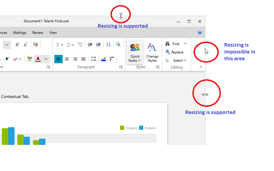 I've attached a screen shot of the RibbonWindow demo showing the behavior of the mouse pointer in various regions of the window.