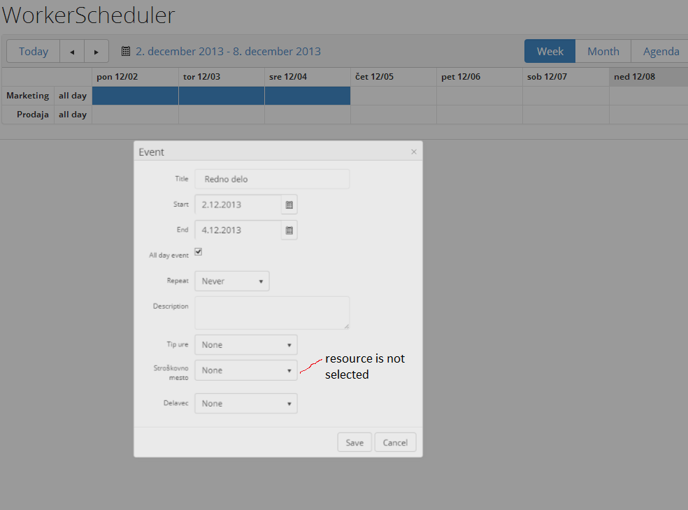 I have scheduler gruping by its resource. Then i create a new all day event by double clicking the cell and the resource is selected in the editor. Then i made the scheduler selectable, and I select 3 day event and hit enter but my resource group is not automatically selected.