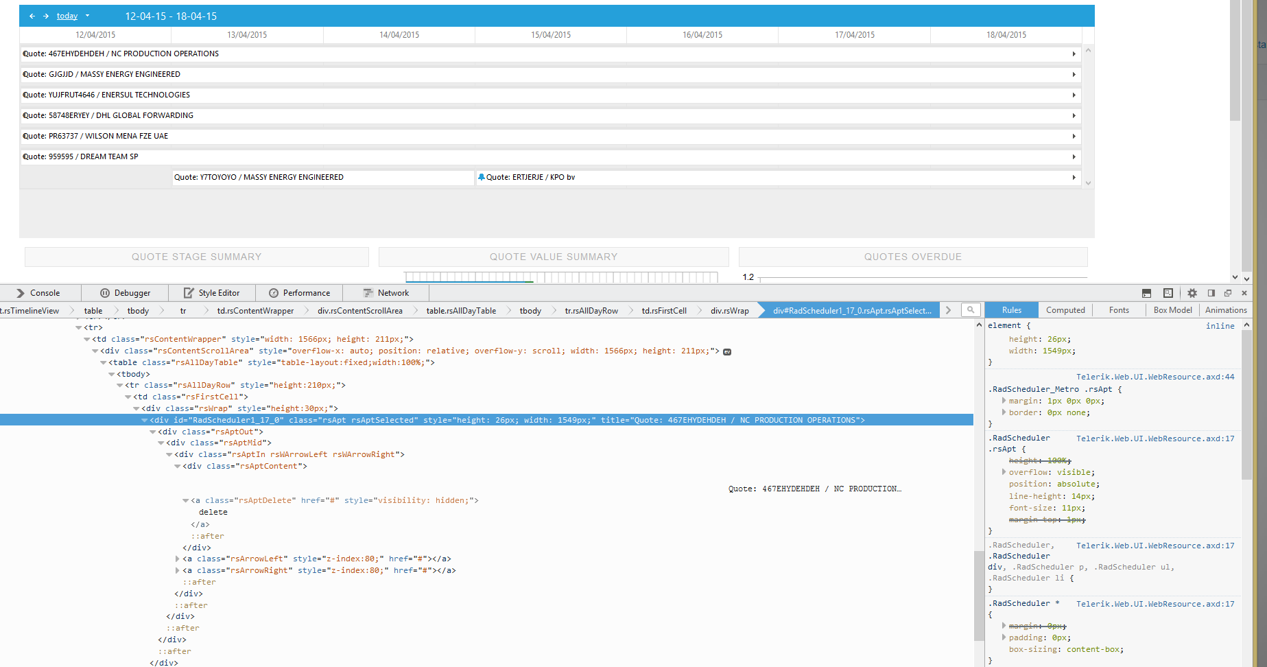 <telerik:RadScheduler ID="RadScheduler1" runat="server" DataDescriptionField="Description" DataEndField="Endtime" DataKeyField="ID" DataReminderField="Reminder" DataSourceID="SqlDataSource1" DataStartField="Starttime" DataSubjectField="Subject" BorderStyle="None" Culture="en-GB" FirstDayOfWeek="Monday" LastDayOfWeek="Friday" SelectedView="TimelineView" ShowFooter="False" ShowHoursColumn="False" EnableDescriptionField="True" AllowDelete="False" BackColor="#EEEEEE" EnableRecurrenceSupport="False" ShowViewTabs="False" StartInsertingInAdvancedForm="True" RowHeight="30px" OnAppointmentDataBound="RadScheduler1_SchedulerDataBound" AllowInsert="False" Height="340px" TimelineView-HeaderDateFormat="d" RowHeaderWidth="46px" > <ExportSettings> <Pdf PageTopMargin="1in" PageBottomMargin="1in" PageLeftMargin="1in" PageRightMargin="1in" AllowAdd="True" AllowModify="True" PageHeight="297mm" PageWidth="210mm" PaperSize="A4"></Pdf> </ExportSettings> <ResourceTypes> <telerik:ResourceType DataSourceID="SqlDataSource1" ForeignKeyField="UserID" KeyField="UserID" Name="Assigned" TextField="Assigned" /> </ResourceTypes> <ResourceStyles> <telerik:ResourceStyleMapping Type="Assigned" Text="DW" ApplyCssClass="CatCheckBox1" BackColor="#3366FF" /> <telerik:ResourceStyleMapping Type="Assigned" Text="NR" ApplyCssClass="rsCategoryBlue"/> <telerik:ResourceStyleMapping Type="Assigned" Text="JK" ApplyCssClass="rsCategoryDarkGreen"/> <telerik:ResourceStyleMapping Type="Assigned" Text="MG" ApplyCssClass="rsCategoryGreen"/> <telerik:ResourceStyleMapping Type="Assigned" Text="NSG" ApplyCssClass="rsCategoryDarkRed"/> <telerik:ResourceStyleMapping Type="Assigned" Text="AR" ApplyCssClass="rsCategoryOrange"/> <telerik:ResourceStyleMapping Type="Assigned" Text="NN" ApplyCssClass="rsCategoryPink"/> <telerik:ResourceStyleMapping Type="Assigned" Text="AMK" ApplyCssClass="rsCategoryRed"/> <telerik:ResourceStyleMapping Type="Assigned" Text="EN" ApplyCssClass="rsCategoryViolet"/> <telerik:ResourceStyleMapping Type="Assigned" Text="SD" ApplyCssClass="rsCategoryYellow"/> </ResourceStyles> <Localization AdvancedNewAppointment="New Schedule" AdvancedEditAppointment="Edit Schedule" AdvancedFrom="Received Date" AdvancedSubjectRequired="Please provide a schedule subject" AdvancedTo="Promised Date" ContextMenuAddAppointment="New Schedule" HeaderAddAppointment="Add Schedule" HeaderAgendaAppointment="Schedule" HeaderDay="1 Day" HeaderWeek="7 Day" /> <TimelineView HeaderDateFormat="dd-MM-yy" NumberOfSlots="7" ShowInsertArea="False" /> <WeekView UserSelectable="False" /> <DayView UserSelectable="False" /> <MultiDayView ReadOnly="True" ShowHoursColumn="False" /> <MonthView UserSelectable="False" VisibleAppointmentsPerDay="3" /> <AgendaView ReadOnly="True" ResourceMarkerType="Bar" /> <AppointmentContextMenuSettings EnableDefault="False" /> <TimeSlotContextMenuSettings EnableDefault="False" /> <Reminders Enabled="True" /> </telerik:RadScheduler>Thanks