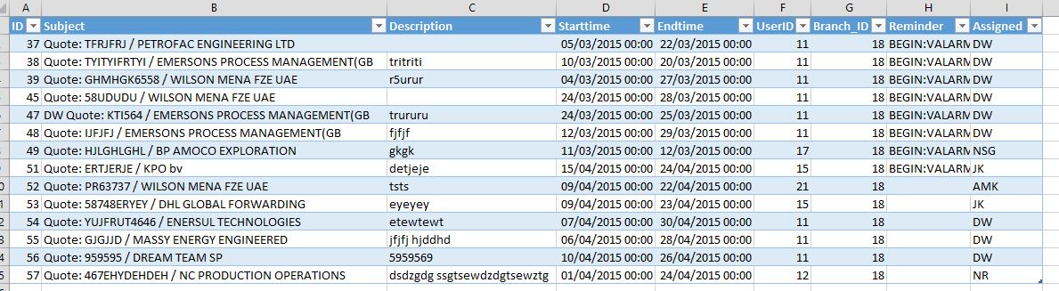 Imports SystemImports System.Web.UI.WebControlsImports Telerik.Web.UIImports Telerik.ReportingImports System.DrawingPartial Public Class Scheduler Inherits System.Web.UI.Page Protected Sub RadScheduler1_SchedulerDataBound(ByVal sender As Object, ByVal e As Telerik.Web.UI.SchedulerEventArgs) e.Appointment.Visible = False FilterAppointment(e.Appointment, BtnCheckBox1, 11) FilterAppointment(e.Appointment, BtnCheckBox2, 12) FilterAppointment(e.Appointment, BtnCheckBox3, 15) FilterAppointment(e.Appointment, BtnCheckBox4, 16) FilterAppointment(e.Appointment, BtnCheckBox5, 17) FilterAppointment(e.Appointment, BtnCheckBox6, 19) FilterAppointment(e.Appointment, BtnCheckBox7, 20) FilterAppointment(e.Appointment, BtnCheckBox8, 21) FilterAppointment(e.Appointment, BtnCheckBox9, 22) FilterAppointment(e.Appointment, BtnCheckBox10, 23) RadScheduler1.ResourceTypes.FindByName("User").AllowMultipleValues = False End Sub Private Shared Sub FilterAppointment(appointment As Appointment, checkBox As ICheckBoxControl, resourceId As Integer) If appointment.Resources.GetResource("User", resourceId) IsNot Nothing AndAlso checkBox.Checked Then appointment.Visible = True End If End Sub Protected Sub btnToggle_Click(sender As Object, e As EventArgs) RadScheduler1.Rebind() End Sub Protected Sub Page_Load(ByVal sender As Object, ByVal e As EventArgs) Handles Me.Load AddHandler RadMenu1.ItemClick, AddressOf menu_ItemClick End Sub Protected Sub RadMenu1_ItemDataBound(ByVal sender As Object, _ByVal e As Telerik.Web.UI.RadMenuEventArgs) Handles RadMenu1.ItemDataBound e.Item.CssClass = CStr(DataBinder.Eval(e.Item.DataItem, "MenuType")) End Sub Protected Sub menu_ItemClick(ByVal sender As Object, ByVal e As RadMenuEventArgs) If e.Item.CssClass = "1" Then Dim uriReportSource = New UriReportSource() 'uriReportSource.Uri = "branch-specific/exports/reports/demo2.trdx" uriReportSource.Uri = (e.Item.Value).ToString ReportViewer1.ReportSource = uriReportSource ReportViewer1.RefreshReport() End If End SubEnd ClassSample SQL Table Data