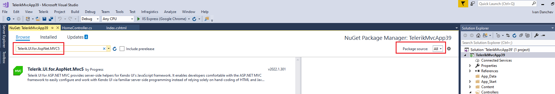 - Set Package source to "All", click on the Browse tab and search for Telerik.UI.for.AspNet.Mvc5 (see the attached screenshot).