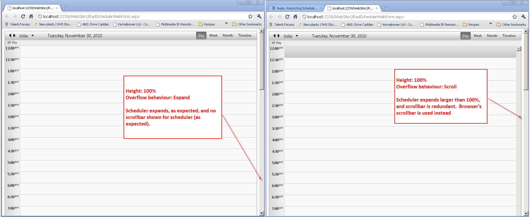 I have a scheduler that I would like to expand to 100% of the available screen, but NOT expand beyond that. Setting the height of the Scheduler to 100% and then the overflow behaviour to EITHER scroll or expand does not seem to do the trick - in both instances, the scheduler expands to extend the height of the window. This is a problem because Chrome and IE do not seem to like it when you drag appointments higher or lower up the screen (ie require an "automatic" scroll) if it is the window's scrollbar that must be used instead of the schedulers.