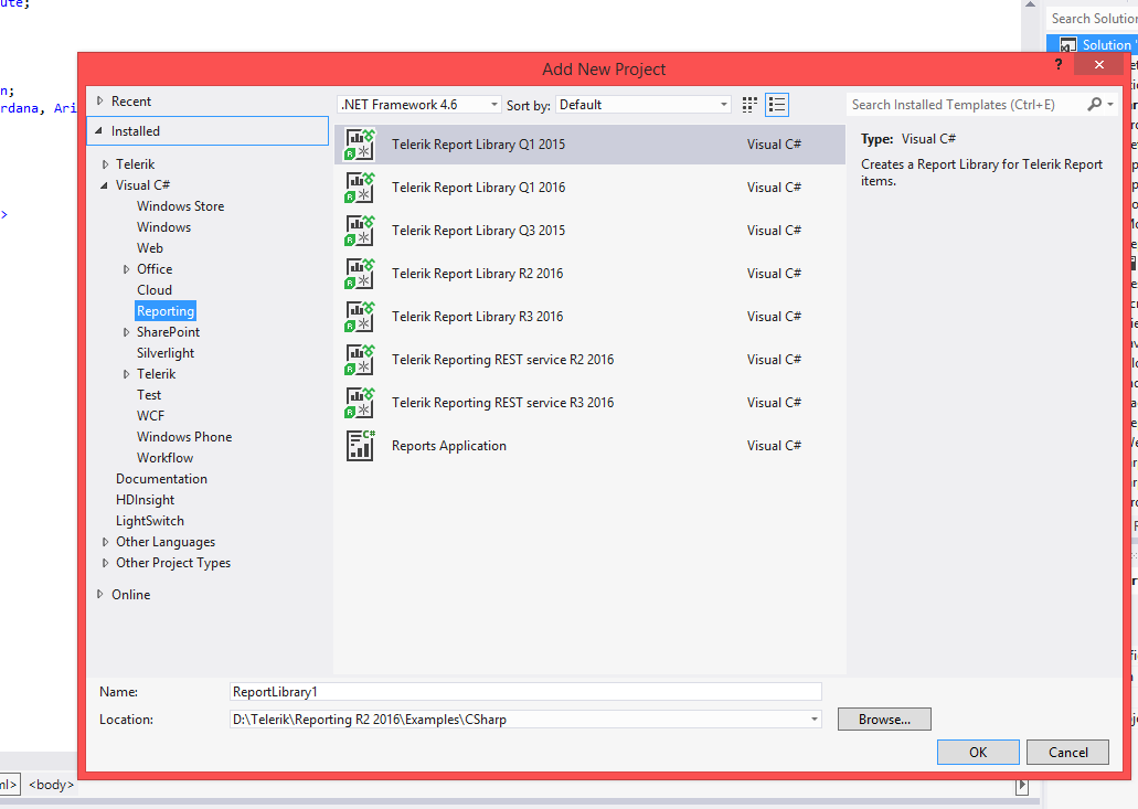 The steps are to create a standard ClassLibrary targeting .NET 4+ Full profile and to add a new item via VS -> select the ClassLibrary ->Add -> New Item -> select Reporting from the menu ->Telerik Report <VERSION e.g. R2 2016> Wizard.