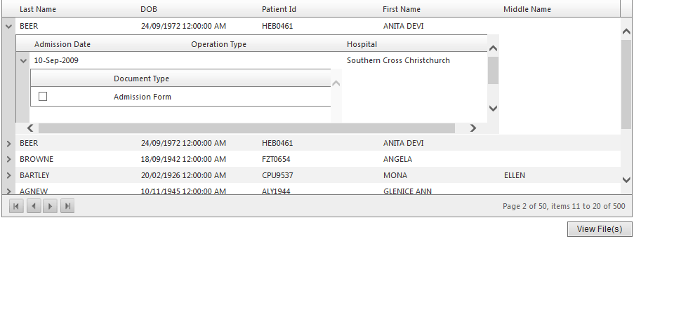 protected void RadGridPatientData_NeedDataSource(object sender, Telerik.Web.UI.GridNeedDataSourceEventArgs e){ if (!e.IsFromDetailTable) { RadGrid.DataSource = GetDataTable("Select * from Country"); }}protected void RadGridPatientData_DetailTableDataBind(object source, Telerik.Web.UI.GridDetailTableDataBindEventArgs e){ GridDataItem dataItem = (GridDataItem)e.DetailTableView.ParentItem; switch (e.DetailTableView.Name) { case "State": { string CountryID = dataItem.GetDataKeyValue("CountryID").ToString(); e.DetailTableView.DataSource = GetDataTable("SELECT * FROM State WHERE CountryID = '" + CountryID + "'"); break; } case "District": { string StateID = dataItem.GetDataKeyValue("StateID").ToString(); e.DetailTableView.DataSource = GetDataTable("SELECT * FROM District WHERE StateID = '" + StateID + "'"); break; } }}public DataTable GetDataTable(string query){ String ConnString = ConfigurationManager.ConnectionStrings["ConnectionString"].ConnectionString; SqlConnection conn = new SqlConnection(ConnString); SqlDataAdapter adapter = new SqlDataAdapter(); adapter.SelectCommand = new SqlCommand(query, conn); DataTable myDataTable = new DataTable(); conn.Open(); try { adapter.Fill(myDataTable); } finally { conn.Close(); } return myDataTable;}protected void chkSelectDoc_CheckChanged(object sender, EventArgs e){ CheckBox box = (CheckBox)sender; GridDataItem item = (GridDataItem)box.NamingContainer; Hashtable target = null; if (item.OwnerTableView.DataMember == "District") { target = DistrictChecked; } if (box.Checked) { target[item["DistrictID"].Text] = true; } else { target[item["DistrictID"].Text] = null; }}private Hashtable DistrictChecked{ get { object res = ViewState["_cc2"]; if (res == null) { res = new Hashtable(); ViewState["_cc2"] = res; } return (Hashtable)res; }}protected void RadGridPatientData_ItemDataBound(object sender, GridItemEventArgs e){ if (e.Item is GridDataItem) { GridDataItem item = e.Item as GridDataItem; CheckBox box = (CheckBox)item.FindControl("chkSelectDoc"); object isChecked = null; if (item.OwnerTableView.DataMember == "District") { isChecked = DistrictChecked[item["DistrictID"].Text]; } if (isChecked != null) { box.Checked = (bool)isChecked == true; } } }Thanks,