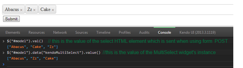 This is a limitation coming from the fact, that when a form is submitted the browser sends the values of the HTML elements inside that form. KendoUI does not affect this behavior and therefore cannot fully support forms in the terms you expect it to.