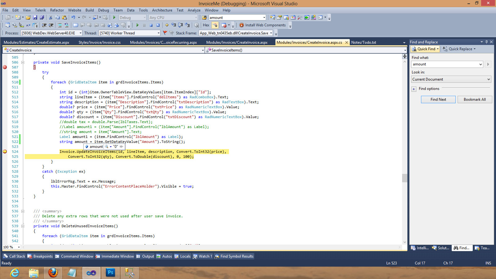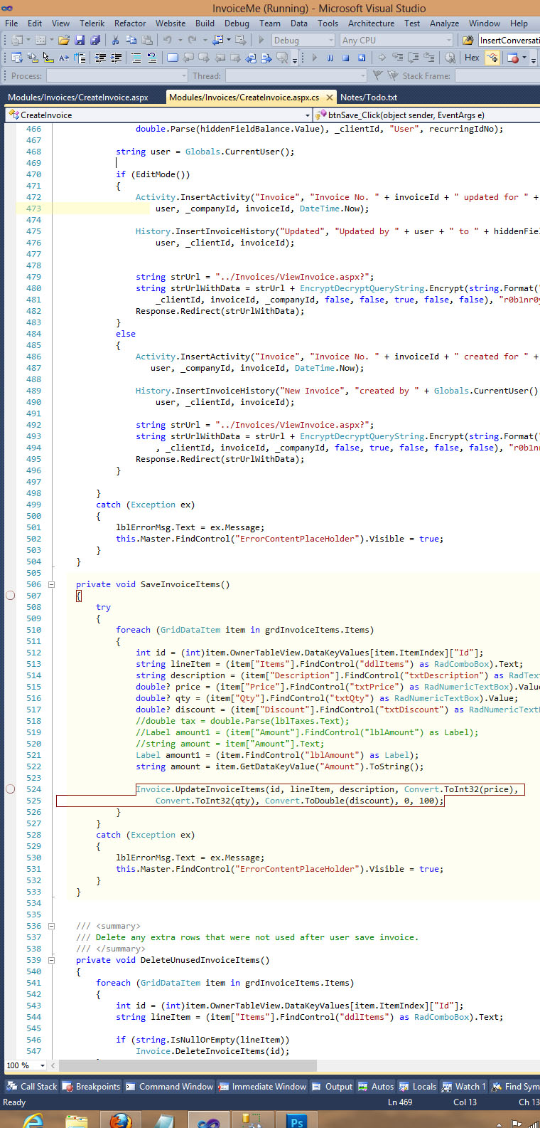 <telerik:GridTemplateColumn DataField="Amount" HeaderText="Amount" UniqueName="Amount" > <ItemStyle CssClass="ItemsGridAmount" BorderStyle="Solid" BorderColor="Black" BorderWidth="1" /> <HeaderStyle Width="85px" HorizontalAlign="Center" /> <ItemTemplate > <asp:Label runat="server" style="position:relative; top:2px; margin-right:8px" ID="lblAmount" Text='<%# DataBinder.Eval (Container, "DataItem.Amount", "{0:F}") %>'>></asp:Label> </ItemTemplate> <EditItemTemplate> <asp:Label runat="server" style="margin-right:10px" ID="lblAmount" Text='<%# DataBinder.Eval (Container, "DataItem.Amount", "{0:F}") %>'>></asp:Label> </EditItemTemplate> </telerik:GridTemplateColumn>ry { foreach (GridDataItem item in grdInvoiceItems.Items) { int id = (int)item.OwnerTableView.DataKeyValues[item.ItemIndex]["Id"]; string lineItem = (item["Items"].FindControl("ddlItems") as RadComboBox).Text; string description = (item["Description"].FindControl("txtDescription") as RadTextBox).Text; double? price = (item["Price"].FindControl("txtPrice") as RadNumericTextBox).Value; double? qty = (item["Qty"].FindControl("txtQty") as RadNumericTextBox).Value; double? discount = (item["Discount"].FindControl("txtDiscount") as RadNumericTextBox).Value; //double tax = double.Parse(lblTaxes.Text); Label amount1 = (item["Amount"].FindControl("lblAmount") as Label); string amount = item["Amount"].Text; Invoice.UpdateInvoiceItems(id, lineItem, description, Convert.ToInt32(price), Convert.ToInt32(qty), Convert.ToDouble(discount), 0, 100); } } catch (Exception ex) { lblErrorMsg.Text = ex.Message; this.Master.FindControl("ErrorContentPlaceHolder").Visible = true; }Thanks,