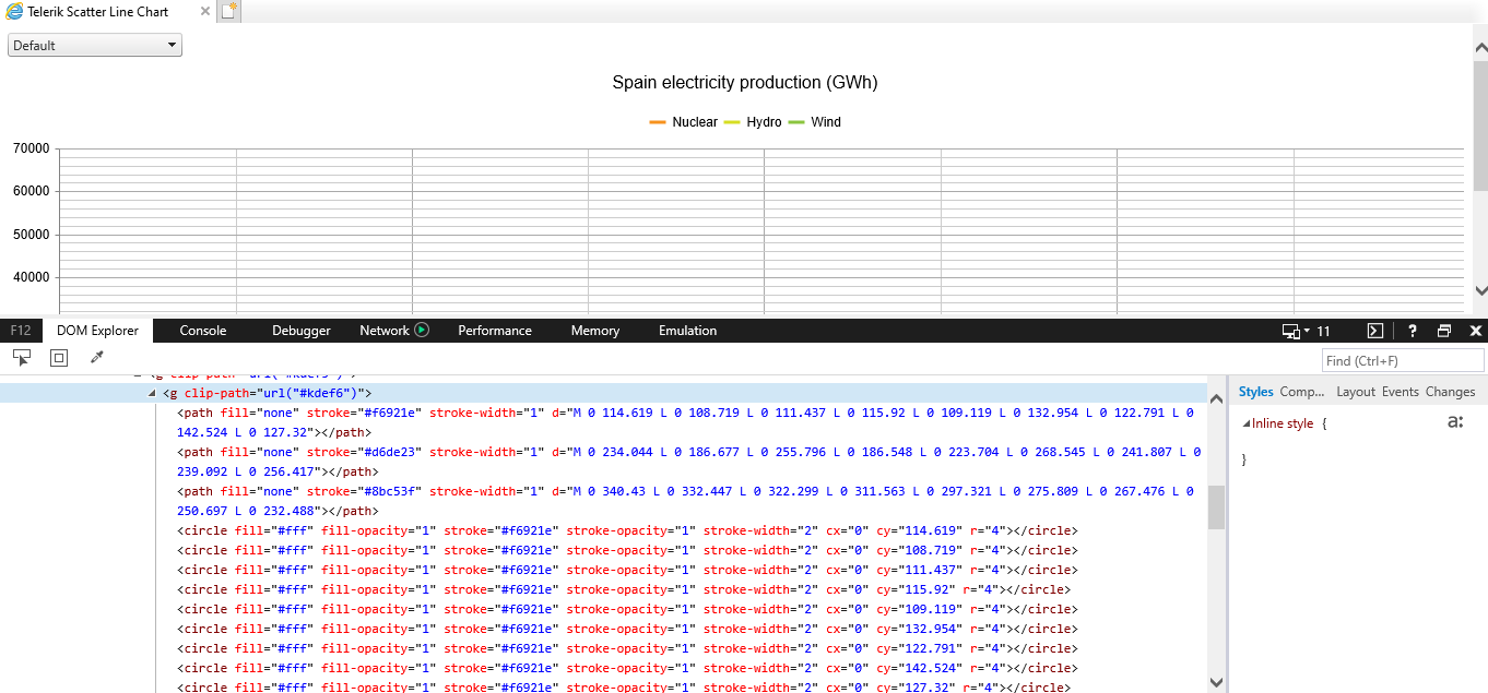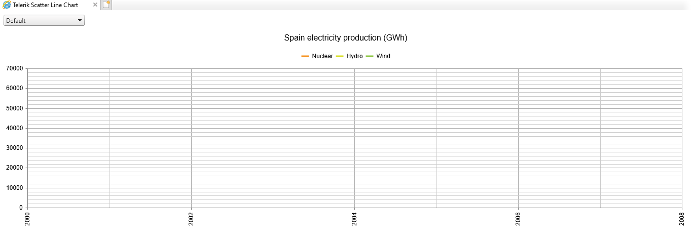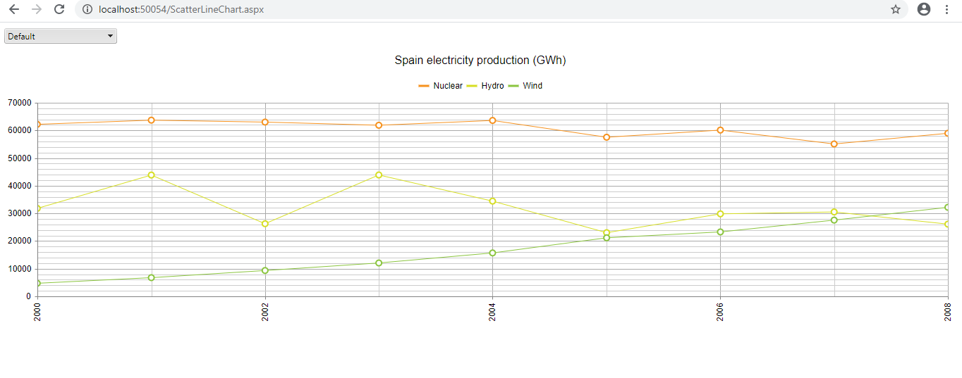<form id="form1" runat="server"> <telerik:RadScriptManager runat="server" ID="RadScriptManager1" /> <telerik:RadSkinManager ID="RadSkinManager1" runat="server" ShowChooser="true" /> <div class="demo-container size-wide"> <telerik:RadClientDataSource ID="ClientDataSource1" runat="server"> <SortExpressions> <telerik:ClientDataSourceSortExpression FieldName="year" SortOrder="Asc" /> </SortExpressions> <DataSource> <WebServiceDataSourceSettings ServiceType="GeoJSON"> <Select Url="electricity.json" DataType="JSON" ContentType="application/json" /> </WebServiceDataSourceSettings> </DataSource> </telerik:RadClientDataSource> <telerik:RadHtmlChart runat="server" ID="RadHtmlChart1" Width="100%" ClientDataSourceID="ClientDataSource1"> <ChartTitle Text="Spain electricity production (GWh)"></ChartTitle> <Legend> <Appearance Position="Top"></Appearance> </Legend> <PlotArea> <Series> <telerik:ScatterLineSeries DataFieldY="nuclear" Name="Nuclear" DataFieldX="year"> <LabelsAppearance Visible="false"></LabelsAppearance> </telerik:ScatterLineSeries> <telerik:ScatterLineSeries DataFieldY="hydro" Name="Hydro" DataFieldX="year"> <LabelsAppearance Visible="false"></LabelsAppearance> </telerik:ScatterLineSeries> <telerik:ScatterLineSeries DataFieldY="wind" Name="Wind" DataFieldX="year"> <LabelsAppearance Visible="false"></LabelsAppearance> </telerik:ScatterLineSeries> </Series> <XAxis DataLabelsField="year"> <LabelsAppearance RotationAngle="-90"></LabelsAppearance> </XAxis> <YAxis Step="10000"></YAxis> <CommonTooltipsAppearance Shared="true" Visible="true"></CommonTooltipsAppearance> </PlotArea> </telerik:RadHtmlChart> </div> </form>