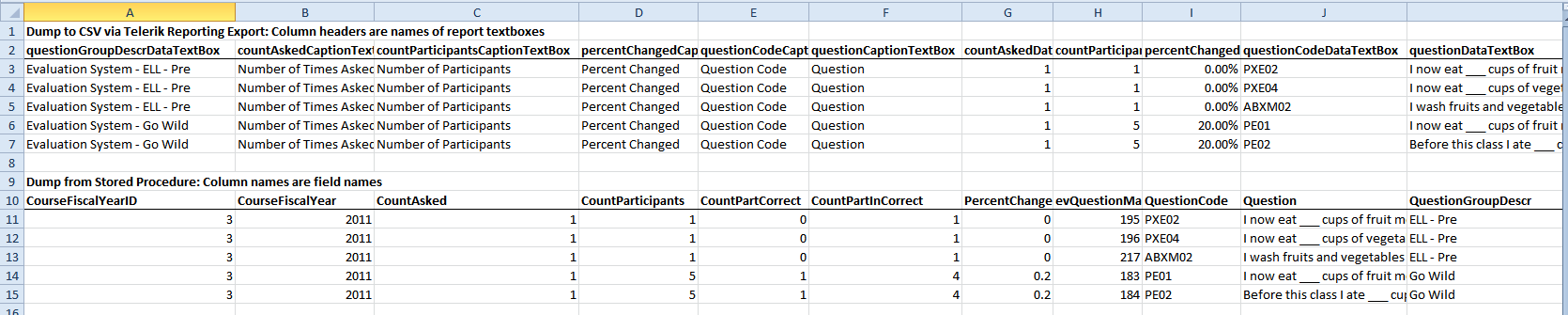 Protected Sub btnDumpToExcel_Click(ByVal sender As Object, ByVal e As System.EventArgs) Handles btnDumpToExcel.Click Dim RunRpt As String = Me.ReportViewer1.Report.Reports(0).Name Dim tb As New DataTable(RunRpt) Dim dataConn As New SqlConnection Select Case RunRpt Case "evRptBehaviorChange" Dim report1 As Snap_EvalReports.evRptBehaviorChange = ReportViewer1.Report.Reports(0)