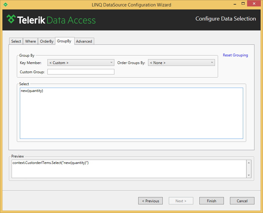 I'm trying to retrieve a some basic related tables using an OpenAccessLinqDatasource control. I can retrieve one table just fine, but I get stuck trying to use the Custom Grouping as described in the documentation.