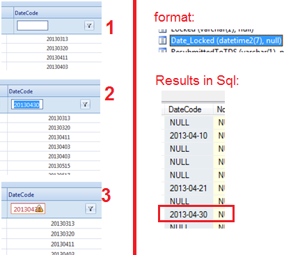 And when I try to filter the column, the filter control gets highlighted in red and a warning sign appear inside of it, but does not have any message. Do you know what is going on? Is it because the format is different from how it is in SQL db? If so, what else do I need to add/change/remove for it to work?