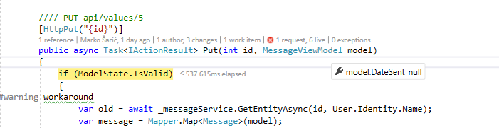 The result of DateSent when I call the Put and Post operation is null and the date is set. I've added Debugging screenshots with pictures of the result that I got on action and also what I've got in the page source