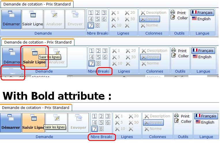 <telerik:RadRibbonBar ID="ribbon_Creation" runat="server" Skin="Outlook"> <telerik:RibbonBarTab Text="Demande de cotation - Prix Standard"> <telerik:RibbonBarGroup Text="Demande" Value="Etape" > <Items> <telerik:RibbonBarToggleButton Text=" DĂ©marrer " Value="e1" Toggled="true" Size="Large" BorderColor="Silver" BorderStyle="Outset" BorderWidth="1px" ToolTip="Saisir l'entĂȘte de la demande" ImageUrl="~/Gen_Images/1Entete.png" ImageUrlLarge="~/Gen_Images/1Entete.png" Font-Bold="True" /> <telerik:RibbonBarToggleButton Text="Saisir Ligne" Value="e2" Size="Large" BorderColor="Silver" BorderStyle="Outset" BorderWidth="1px" ToolTip="Saisir les lignes" ImageUrlLarge="~/Gen_Images/2Lignes.png" Font-Bold="True" /> <telerik:RibbonBarToggleButton Text=" Analyser " Value="e3" Size="Large" BorderColor="Silver" BorderStyle="Outset" BorderWidth="1px" DisabledImageUrl="~/Gen_Images/3analyse_disable.png" DisabledImageUrlLarge="~/Gen_Images/3analyse_disable.png" ToolTip="Analyser les lignes" ImageUrlLarge="~/Gen_Images/3analyse.png" Font-Bold="True" /> <telerik:RibbonBarToggleButton Text=" Envoyer " Value="e4" Size="Large" BorderColor="Silver" BorderStyle="Outset" BorderWidth="1px" ToolTip="Lancer la demande de cotation" DisabledImageUrl="~/Gen_Images/4lancer_disable.png" DisabledImageUrlLarge="~/Gen_Images/4lancer_disable.png" ImageUrlLarge="~/Gen_Images/4lancer.png" Font-Bold="True" /> </Items> </telerik:RibbonBarGroup> <telerik:RibbonBarGroup Text="Nbre Breaks" Value="Break"> <Items> <telerik:RibbonBarToggleButton Size="Small" Value="b1" ToolTip="Nombre de break=1" ImageUrl="~/Gen_Images/numero_1.png" /> <telerik:RibbonBarToggleButton Size="Small" Value="b4" ToolTip="Nombre de break=4" ImageUrl="~/Gen_Images/numero_4.png" /> <telerik:RibbonBarToggleButton Size="Small" Value="b7" ToolTip="Nombre de break=7" ImageUrl="~/Gen_Images/numero_7.png" /> <telerik:RibbonBarToggleButton Size="Small" Value="b2" ToolTip="Nombre de break=2" ImageUrl="~/Gen_Images/numero_2.png" /> <telerik:RibbonBarToggleButton Size="Small" Value="b5" ToolTip="Nombre de break=5" ImageUrl="~/Gen_Images/numero_5.png" /> <telerik:RibbonBarToggleButton Size="Small" Value="b8" ToolTip="Nombre de break=8" ImageUrl="~/Gen_Images/numero_8.png" /> <telerik:RibbonBarToggleButton Size="Small" Value="b3" ToolTip="Nombre de break=3" ImageUrl="~/Gen_Images/numero_3.png" Toggled="True" /> <telerik:RibbonBarToggleButton Size="Small" Value="b6" ToolTip="Nombre de break=6" ImageUrl="~/Gen_Images/numero_6.png" /> </Items> </telerik:RibbonBarGroup> <telerik:RibbonBarGroup Text="Lignes" Value="Ligne"> <Items> <telerik:RibbonBarButton Text="1" Value="a1" ImageUrlLarge="~/Gen_Images/add_lignes.png" ToolTip="Ajouter une ligne" ImageUrl="~/Gen_Images/add_lignes.png" Size="Medium" /> <telerik:RibbonBarButton Text="5" Value="a5" ToolTip="Ajouter 5 lignes" ImageUrl="~/Gen_Images/add_lignes.png" Size="Medium" /> <telerik:RibbonBarButton Text="10" Value="a10" ToolTip="Ajouter 10 lignes" ImageUrl="~/Gen_Images/add_lignes.png" Size="Medium" /> <telerik:RibbonBarButton Text="20" Value="a20" ToolTip="Ajouter 20 lignes" ImageUrl="~/Gen_Images/add_lignes.png" Size="Medium" /> <telerik:RibbonBarButton Text="50" Value="a50" ToolTip="Ajouter 50 lignes" ImageUrl="~/Gen_Images/add_lignes.png" Size="Medium" /> <telerik:RibbonBarButton Size="Medium" Text=" " Value="s1" ToolTip="Supprimer les lignes vides" ImageUrl="~/Gen_Images/del_lignes.png" /> </Items> </telerik:RibbonBarGroup> <telerik:RibbonBarGroup Text="Colonnes" Value="Colonne"> <Items> <telerik:RibbonBarToggleButton Text="Description" Value="c1" ImageUrlLarge="~/Gen_Images/add_colonne.png" ToolTip="Ajouter la description de l'article" ImageUrl="~/Gen_Images/add_colonne.png" Size="Medium" /> <telerik:RibbonBarToggleButton Text="Devise" Value="c2" ImageUrlLarge="~/Gen_Images/add_colonne.png" ToolTip="Ajouter la devise de cotation" ImageUrl="~/Gen_Images/add_colonne.png" Size="Medium" /> <telerik:RibbonBarToggleButton Text="Norme" Value="c3" ImageUrlLarge="~/Gen_Images/add_colonne.png" ToolTip="Ajouter Article Norme (ou client)" ImageUrl="~/Gen_Images/add_colonne.png" Size="Medium" /> </Items> </telerik:RibbonBarGroup> <telerik:RibbonBarGroup Text="Outils" Value="Autre"> <Items> <telerik:RibbonBarTemplateItem> <asp:HyperLink runat="server" NavigateUrl="~/Consultation/Print_Cotation_CSR.aspx?IdDoc=" Target="_blank" ID="Report_Offre" Text="Imprimer" ImageUrl="~/Gen_Images/Print.png" ToolTip="Affichage d'une page pour permettre l'impression."> </asp:HyperLink> <asp:Label ID="Label1" runat="server" Text=" Print<br>"></asp:Label> <asp:HyperLink runat="server" NavigateUrl="~/Consultation/Creation_CC.aspx.aspx?IdDoc=" Target="_blank" ID="SaisieColler" Text="Coller" ImageUrl="~/Gen_Images/ico_modifier_16.png" ToolTip="Saisie par copier coller"> </asp:HyperLink> <asp:Label ID="Label2" runat="server" Text=" Coller"></asp:Label> </telerik:RibbonBarTemplateItem> </Items> </telerik:RibbonBarGroup> <telerik:RibbonBarGroup Text="Langue" Value="Langue"> <Items> <telerik:RibbonBarToggleButton Text="Français" Value="FR" ToolTip="Français" ImageUrl="~/Gen_Images/fr.png" Size="Medium" /> <telerik:RibbonBarToggleButton Text="English" Value="EN" ToolTip="English" ImageUrl="~/Gen_Images/usa.png" Size="Medium" /> </Items> </telerik:RibbonBarGroup> </telerik:RibbonBarTab> </telerik:RadRibbonBar>