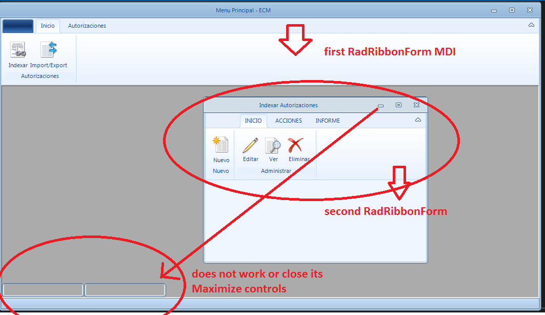 By minimizing the RadRibbonForm son, does not work or close its Maximize controls .