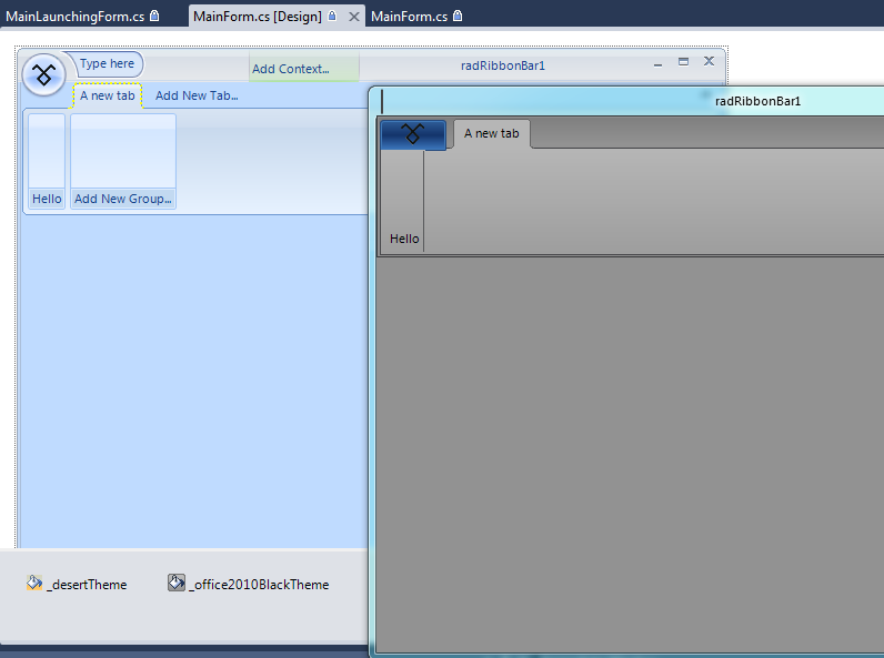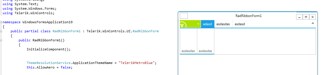 ThemeResolutionService.ApplicationThemeName = "TelerikMetroBlue";Please assist because as you can see from the attached png, the ribbonform looks really ugly.