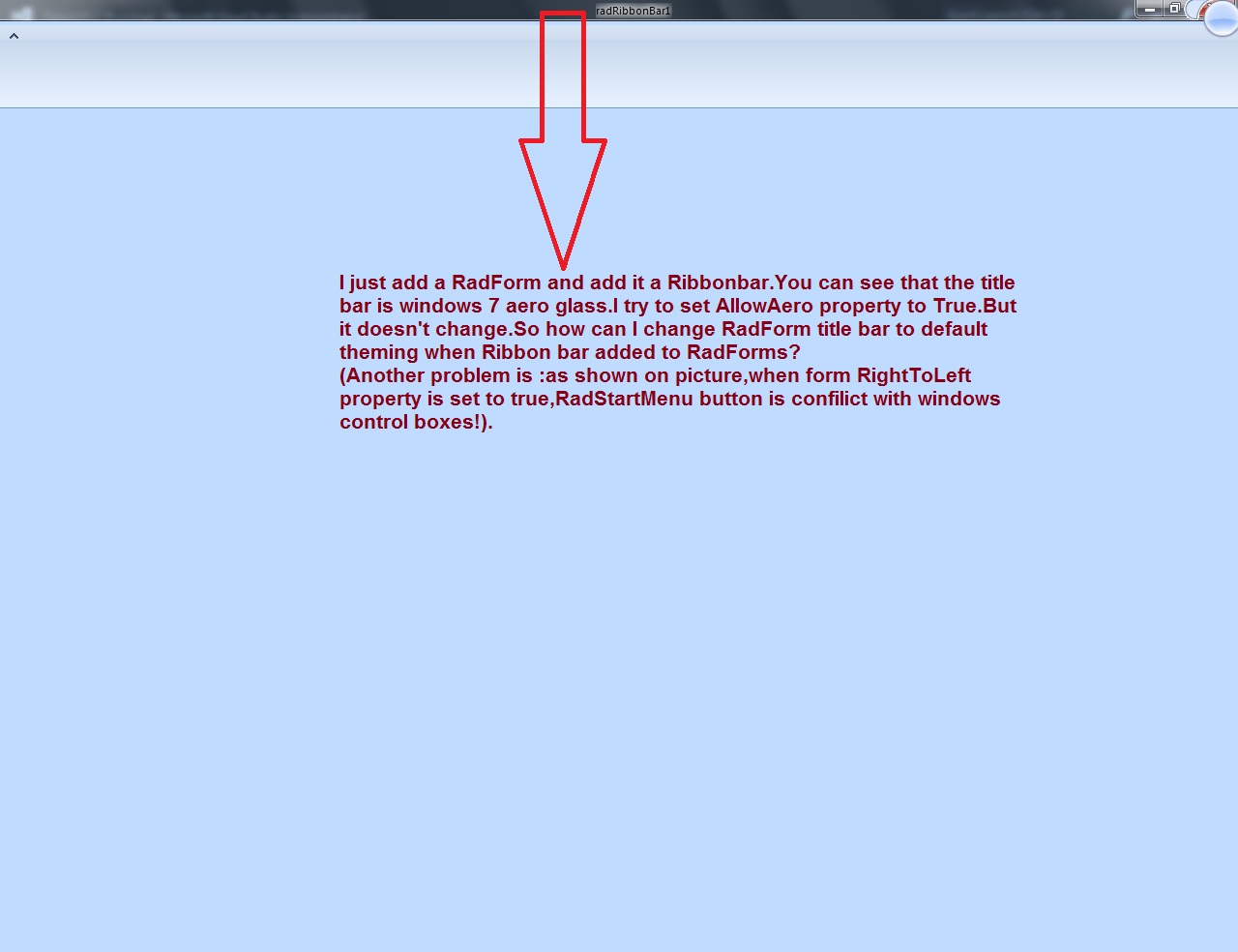 I forgot to say that my problem is when a Ribbon bar add to RadForm,I try to set AllowAero property to True,but it doesn't changes.(Please see the attached picture)How can I fix this problem?(All of my forms contain Ribbonbars and I don't want to see windows aero glass theme.I want to see RadForm default title bar.)