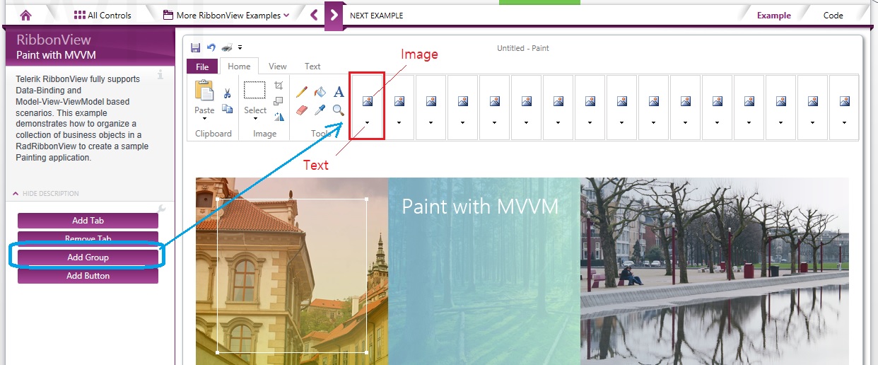 But, I can't find how to access RadRibbonGroup in xaml or code in "Paint with MVVM" sample.