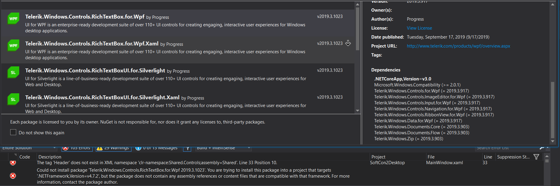 The selected package is targeting .NET 3 Core and it cannot be used in a regular .NET framework project. Bellow, you can find the ones for .NET 4.0 and 4.5. The attached image shows this.