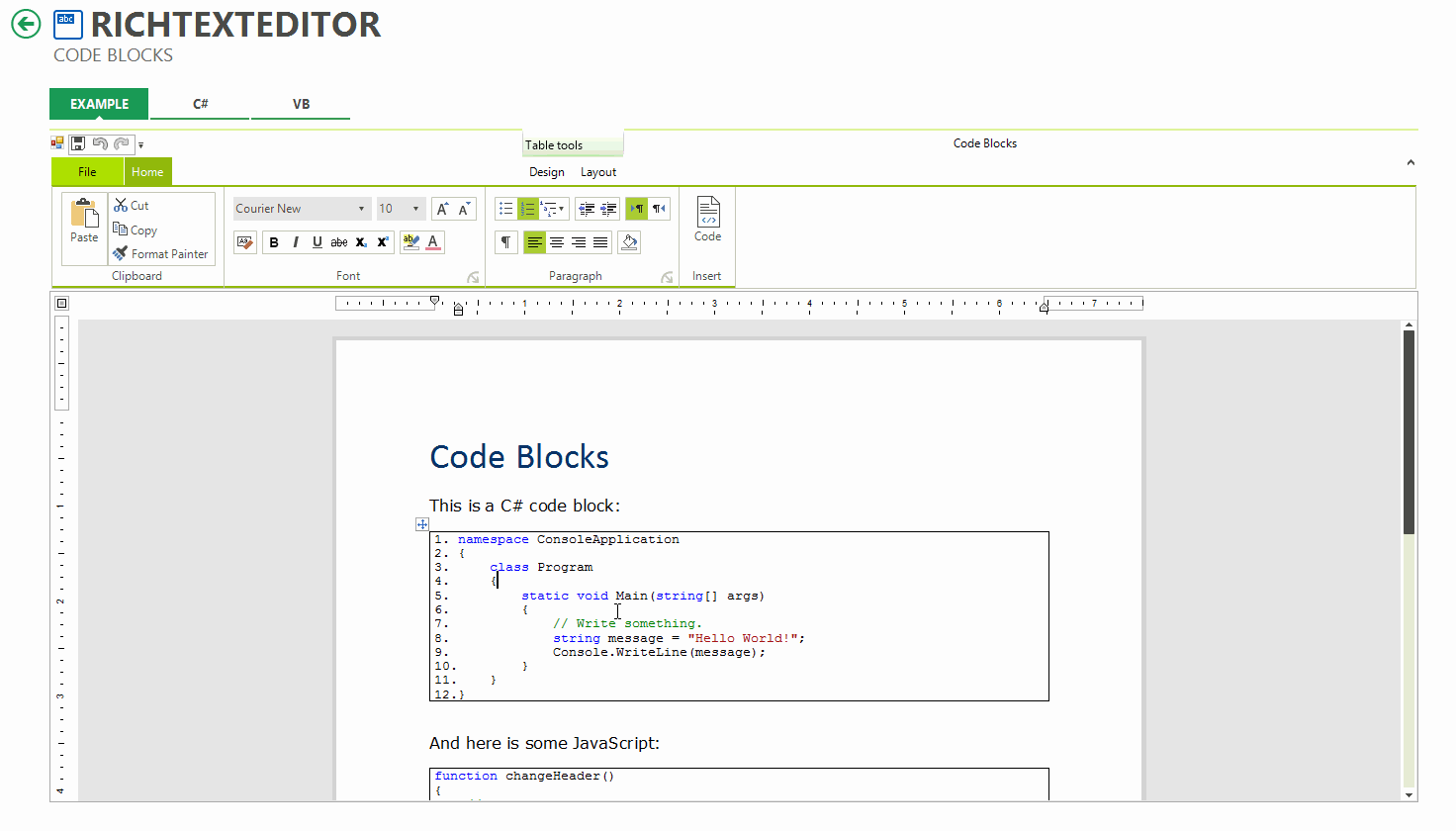 RadRichTextEditor provides functionality for editing the imported code snippets. However, this cannot be performed dynamically and one needs to use the context menu and the Format Code Block dialog: http://docs.telerik.com/devtools/winforms/richtexteditor/features/code-block.
