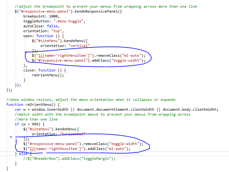 Additionally, I am using the responsive panel to toggle the menu to vertical below a breakpoint, so in my panel implementation I check the window width to remove or add the "ml-auto" class to control the display, i.e. remove the right alignment during vertical orientation and restore it when horizontal (see image)