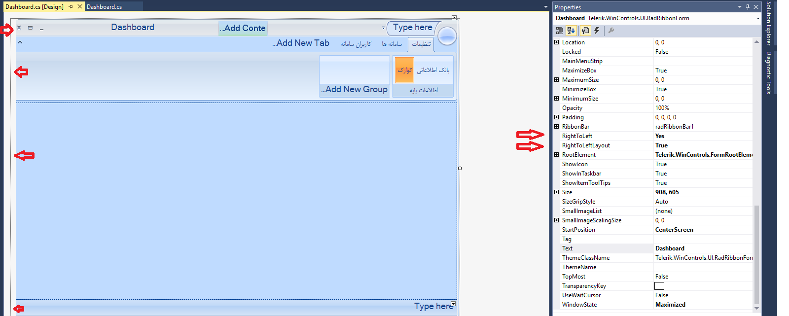 public partial class RadRibbonForm1 : Telerik.WinControls.UI.RadRibbonForm{ public RadRibbonForm1() { InitializeComponent(); this.RightToLeft = System.Windows.Forms.RightToLeft.Yes; this.AllowAero = false; }}Your other question does not appear to be related to our suite. Your project appears to be under source control, so please check the following threads discussing a similar setup: