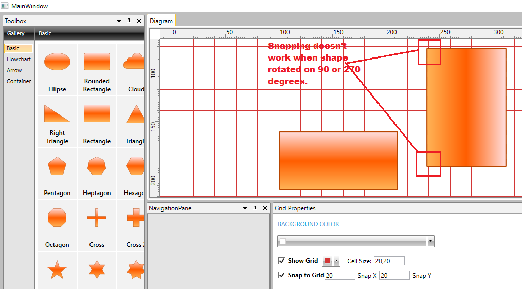 For example I took an DockingIntegration_WPF project from examples provided by Telerik. I set up grid snapping and it has worked fine, until I have rotated the shape on 90 (or 270) degrees.