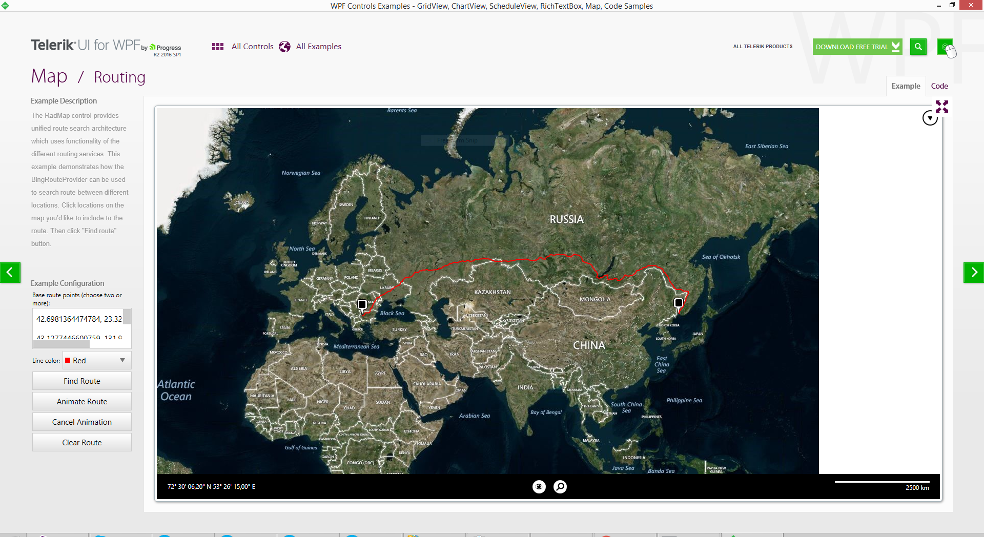 I have problem when make big route for example from Sofia, Bulgaria to Vladivostok, Russia. My code is like your example in 'Demos - Telerik UI for WPF'.