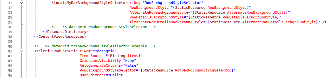 I am trying to style the background color of Rows in a RadDataGrid by the following the SDKBrowser MAUI Example (from GitHub).