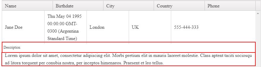 <div id="grid"></div><script>$("#grid").kendoGrid({ groupable: true, columns: [ { title: "Name", field: "name" }, { title: "Birthdate", field: "birthdate" }, { title: "City", field: "city" }, { title: "Country", field: "country" }, { title: "Phone", field: "phone" }, { hidden: true, title: "Descripcion", field: "descrip" } ], editable: true, dataBound: function (e) { dataBoundGridMain(e) }, dataSource: [ { name: "Jane Doe", birthdate: new Date("1995/05/04"), city: "London", country: "UK", phone: "555-444-333", descrip: "Lorem ipsum dolor sit amet, consectetur adipiscing elit. Morbi pretium elit in mauris laoreet molestie. Class aptent taciti sociosqu ad litora torquent per conubia nostra, per inceptos himenaeos. Praesent et leo tellus." }, { name: "Jhon Doe", birthdate: new Date("1997/05/04"), city: "Londo", country: "UK", phone: "555-444-356", descrip: "Lorem ipsum dolor sit amet, consectetur adipiscing elit. Morbi pretium elit in mauris laoreet molestie. Class aptent taciti sociosqu ad litora torquent per conubia nostra, per inceptos himenaeos." }, { name: "Jhon Doe", birthdate: new Date("1997/05/04"), city: "New York", country: "USA", phone: "555-444-356", descrip: "Lorem ipsum dolor sit amet, consectetur adipiscing elit. Morbi pretium elit in mauris laoreet molestie. Class aptent taciti sociosqu ad litora torquent per conubia nostra, per inceptos himenaeos." } ]}); function dataBoundGridMain(e){ var kendoGrid = e.sender; var rows = kendoGrid.tbody.children(); var dataItem = null; var rowElement = null; var dataRowGrid = kendoGrid.dataItems(); var rowLen = dataRowGrid.length, index = 0; console.log("test") for (index; index < rowLen; index++) { rowElement = rows[index]; dataItem = dataRowGrid[index]; if (dataItem.hasOwnProperty('descrip')) { addDescriptionTextNewRow(kendoGrid, dataItem, $(rowElement)); } } } function addDescriptionTextNewRow(kendoGrid, dataItem, rowElement){ var rowsElement, title, value, colsNumber, rowRender; if (dataItem.hasOwnProperty('descrip')) { title = 'Description'; value = dataItem.descrip; } colsNumber = kendoGrid.columns.length rowsElement = "<tr><td colspan=" + colsNumber + " style= 'color:#434343; font:12px DroidBold; text-align: left; border-bottom:1px; height: 8px; padding:5px 0 0 5px;' >" + title + "</td></tr>"; rowsElement += "<tr><td colspan=" + colsNumber + " style= 'color:#434343; font:Arial 10px; text-align: left' >" + value + "</td></tr>"; rowRender = $(rowsElement); rowElement.after(rowRender[1]); rowElement.after(rowRender[0]); } </script>