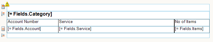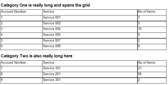 Such layout can be easily achieved with a List item (which is essentially a Table with one column and Panel as container), that has group by Category and nested table that obtains its data through Bindings. The Category textbox and the nested table are placed in the list's Panel so if the Category textbox grows vertically, it will push the table below.