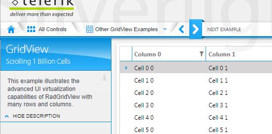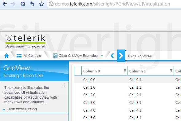 You can find error in Scrolling 1 Billion Cells(http://demos.telerik.com/silverlight/#GridView/UIVirtualization )